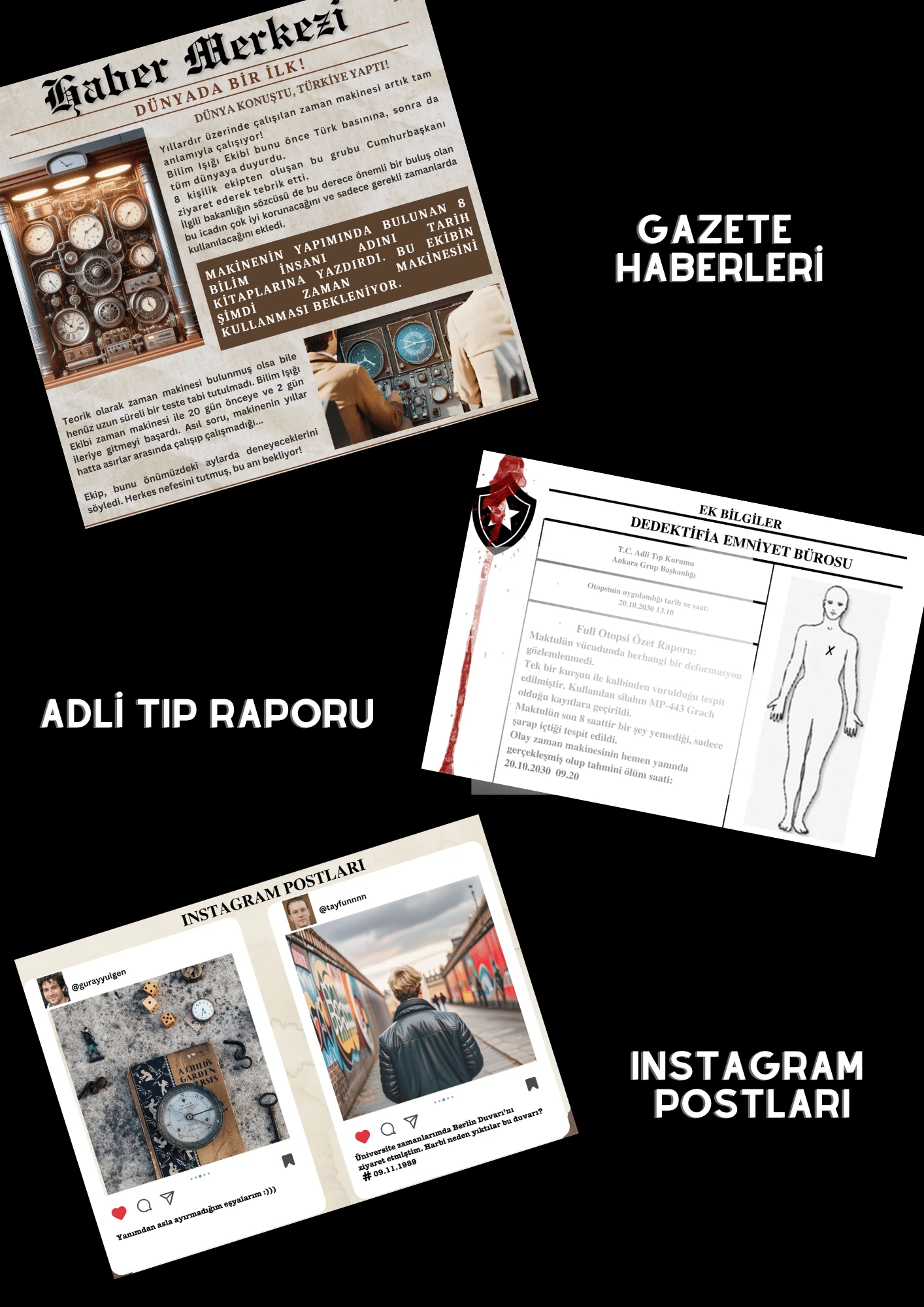 Şüpheli ifadeleri, şüphelilerin mesajlı görüşmeleri, Saat Delili (Kalın kağoıt baskı), Deliller, Karakter haritası, Bilim İnsanlarının geçmişten getirdiği bazı şeyler, Gazete Küpürü, Dijital interaktif İtiraf Mektubu ve ipuçları, Dedektifia Bürosu tarafından yollanan ses kaydı.